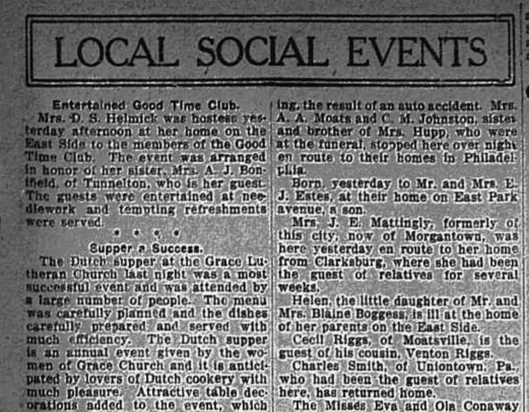 The society pages have solved several mysteries outright and given hints that have pointed me in the right direction in other cases. One in particular was an announcement that two men, cousins, were traveling together to the funeral of their uncle (my ancestor). It showed that the mysterious older sister of the two known children had survived, gotten married, and had at least one son. The son’s name and the surname gave me the launching point for discovering a whole new branch of the family that had been lost to us for several generations.