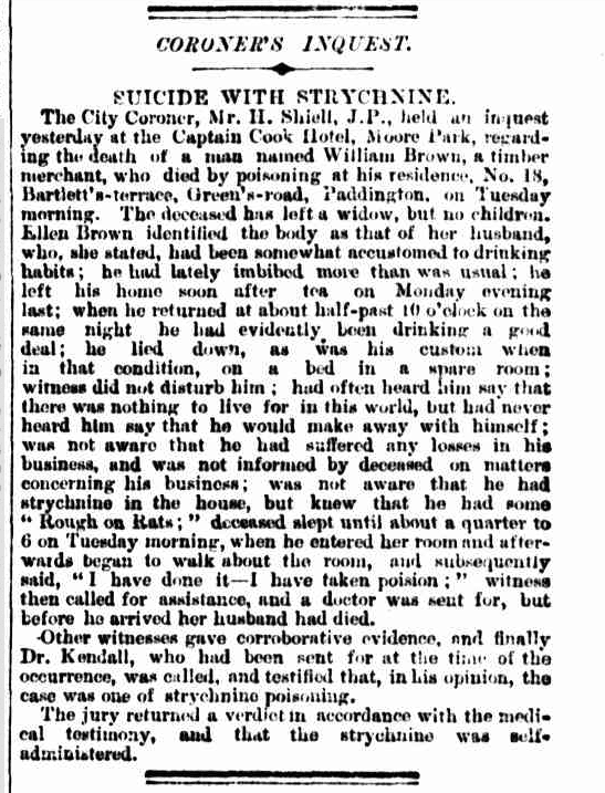Source: Coroner’s inquest. – suicide with strychnine. – The Sydney Morning Herald (NSW : 1842 – 1954) – 12 Jan 1888 (1888) Trove. Available at: https://trove.nla.gov.au/newspaper/article/13679911 (Accessed: 31 October 2025).