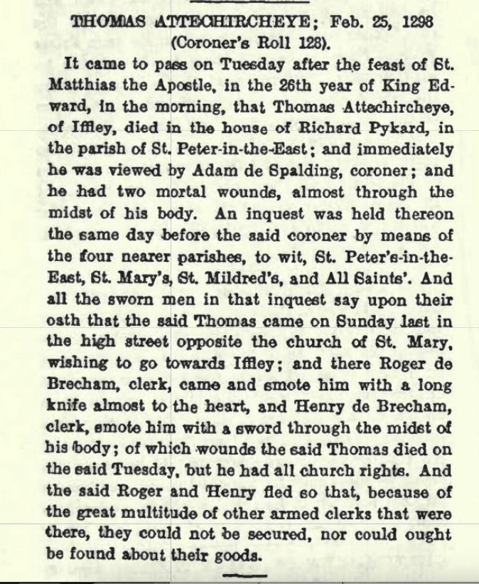 Oxford Chronicle Company, Ltd. (n.d.). Records of mediæval Oxford. Coroners’ inquests, the walls of Oxford, etc.,/ edited by the Rev. H.E. Salter … 1912, p6. FamilySearch.org. http://www.familysearch.org/library/books/idurl/1/45023